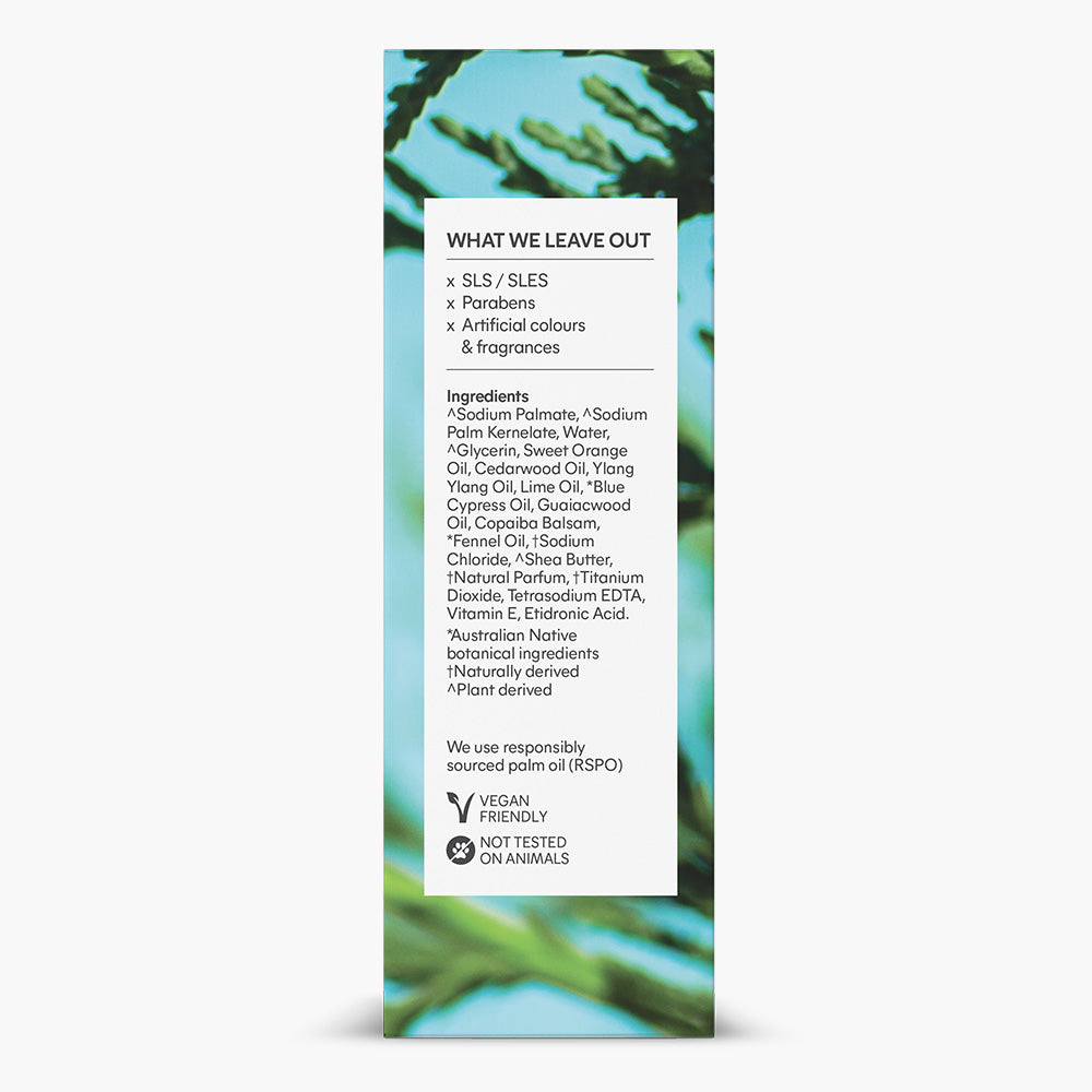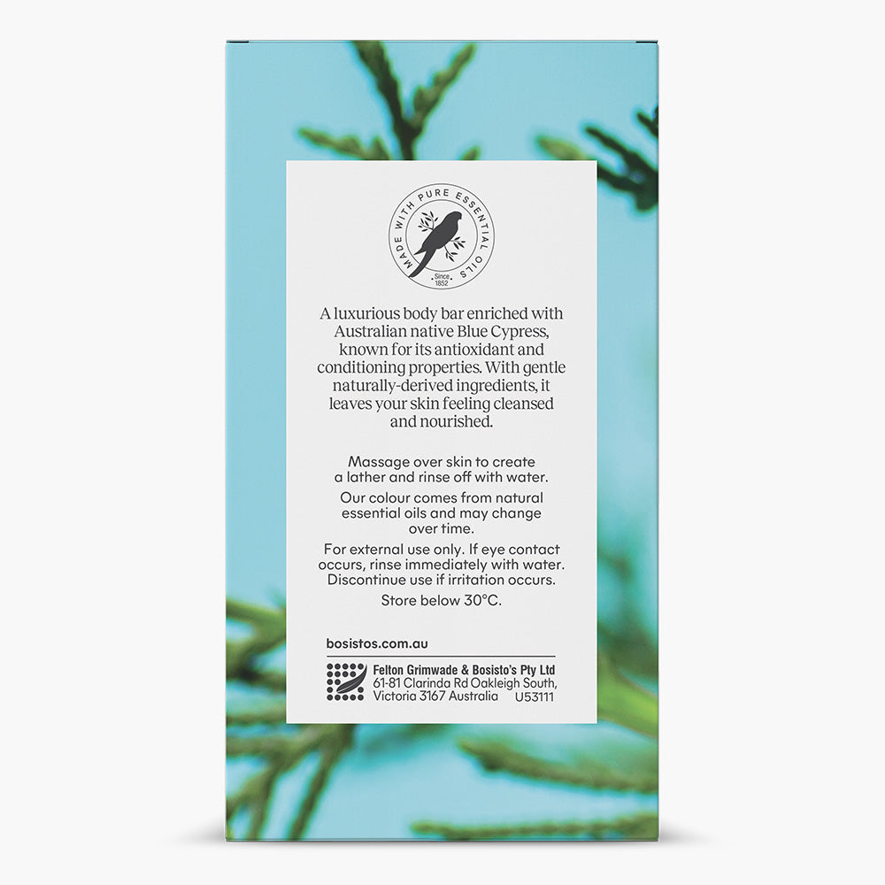 A luxurious body bar enriched with Australian native Blue Cypress, known for its antioxidant and conditioning properties. With gentle naturally-derived ingredients, it leaves your skin feeling cleansed and nourished.• Moisturising Body Bar enriched with Australian native Blue Cypress• Triple milled • Made with pure essential oils • No artificial colours or fragrances • No SLS/SLES or Parabens • Not tested on animals, Vegan friendly • Australian made and owned